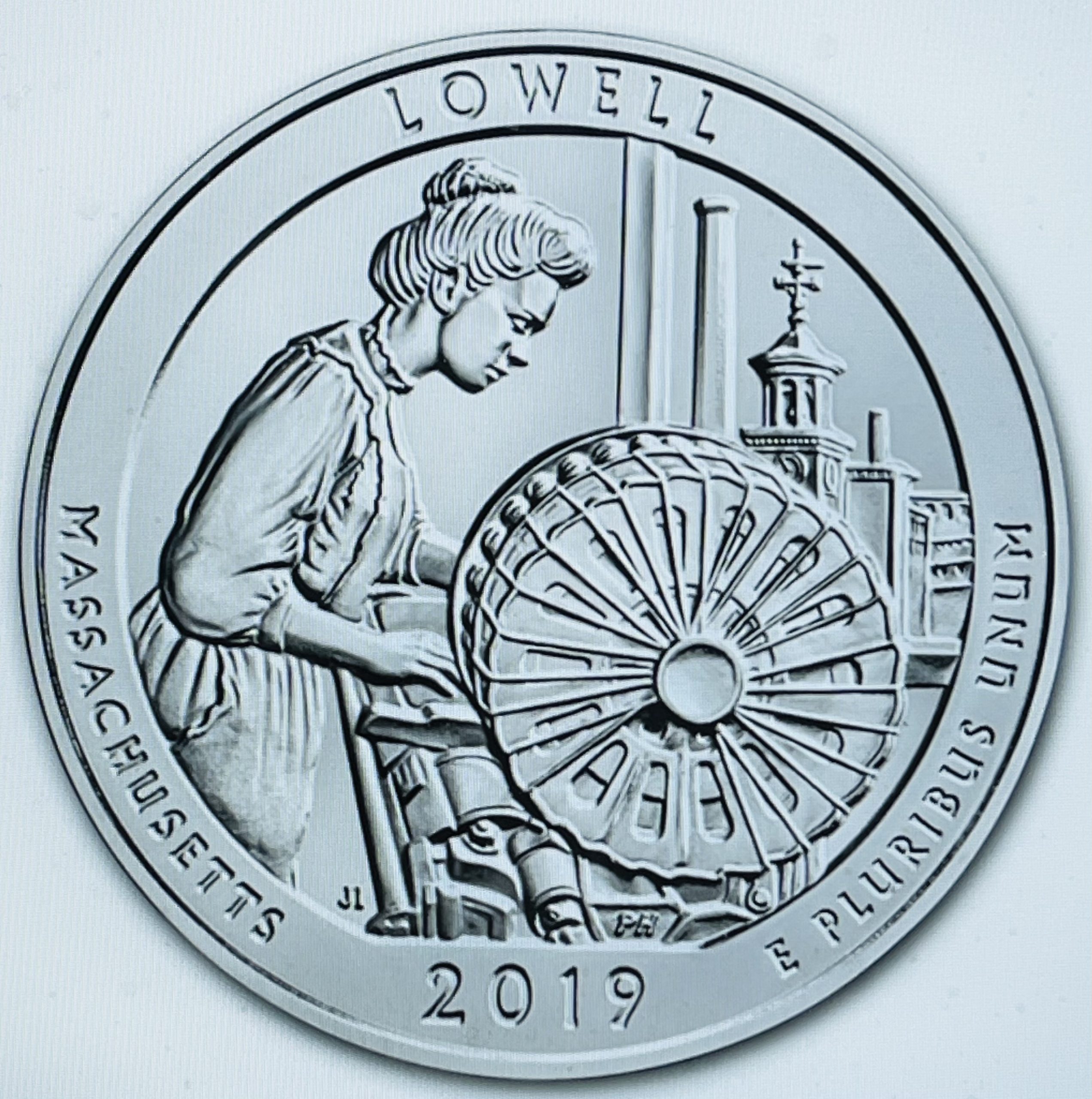 Reverse of the 2015 America the Beautiful 5 Ounce Silver Quarter of a Lowell Mill Girl. Image courtesy of APMEX.