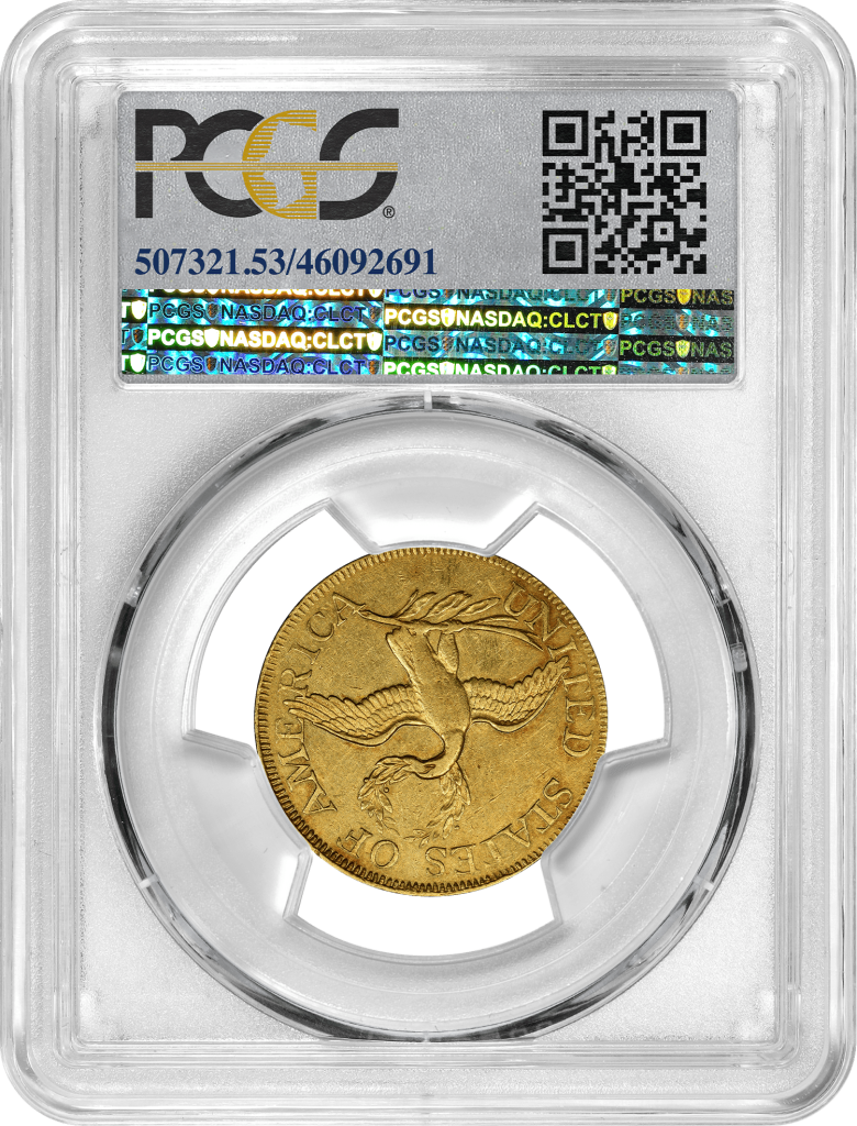 Only six or seven of this extremely rare series are known to remain in existence, and two of those are part of the National Numismatic Collection at the Smithsonian Institution. Its lore includes the unconfirmed, yet likely, idea that it was minted in 1797 because a yellow fever epidemic forced the Philadelphia Mint to close, increasing the late-year demand for coinage. The coin’s small eagle design was later replaced with a Heraldic Eagle on the reverse. This coin was purchased as part of a collection by Egypt’s King Farouk in the 1940s and sold by Sotheby’s in 1954 after Farouk’s regime fell. Graded by PCGS, this piece scored an AU55 and sold on January 15 for $3 million.